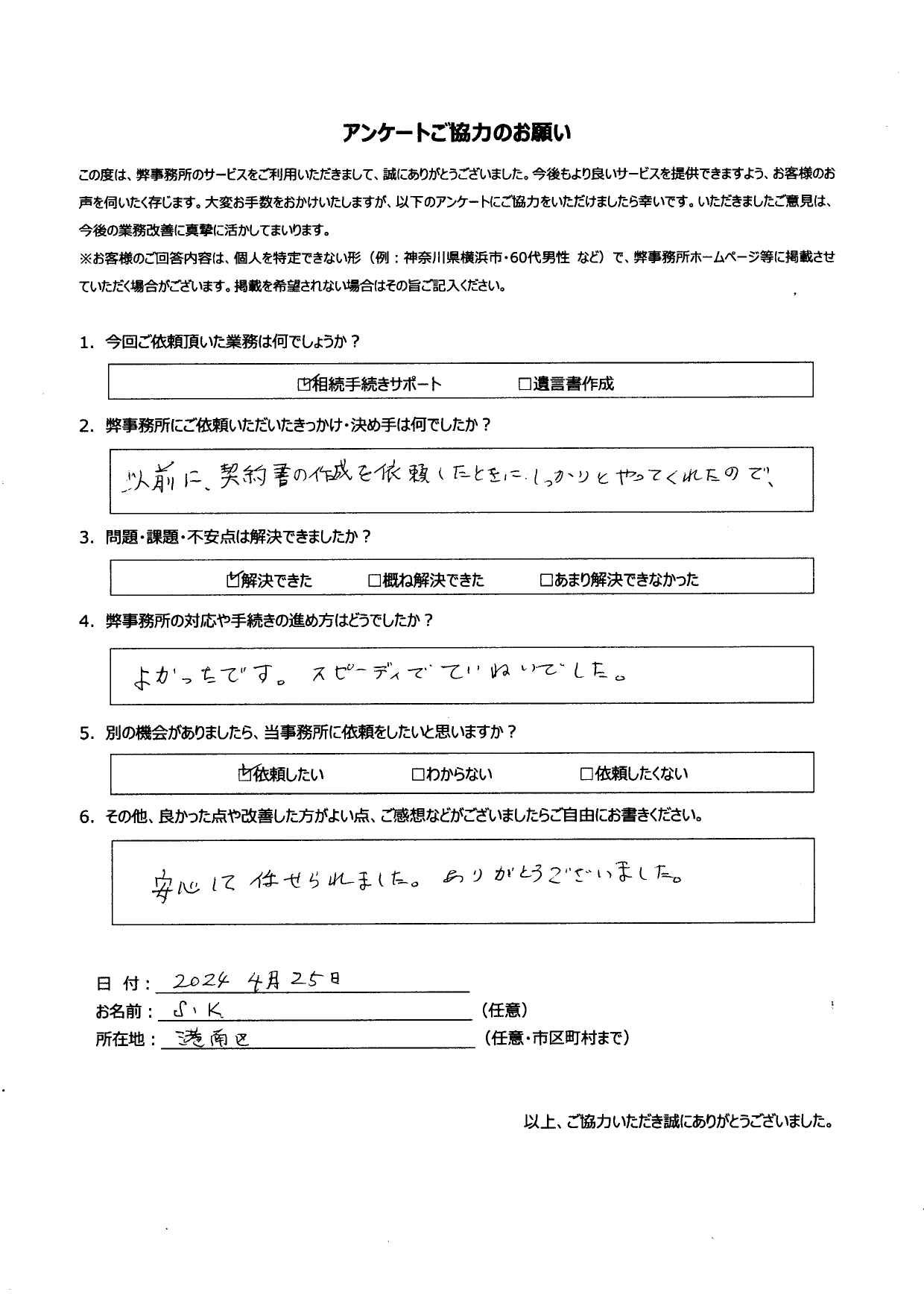 2024年4月25日 神奈川県 横浜市港南区 S.K 様